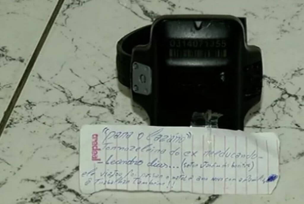 Uma tornozeleira eletrônica foi deixada junto com um bilhete na Central de Flagrantes de Gurupi, no Sul de Tocantins. No recado, havia o nome do preso e o motivo de ele ter quebrado as regras de monitoramento.