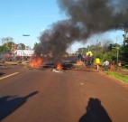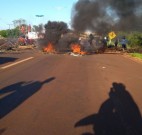 Para bloquear a passagem dos veículos, os manifestantes colocaram fogo em galhos de árvores e pneus na via. O ato deve ocorrer a manhã toda.