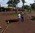 Uma enorme cratera se abriu no meio do asfalto, ocupando parte  da Rua Lindalva Marques, no Parque do Lago II, em Dourados.