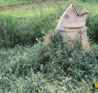 O telhado do quiosque está quebrado, oferecendo risco aos transeuntes, e, mesmo sendo estátua, o peixe parece saltar buscando oxigênio, pois também está encoberto. As lixeiras também estão em estado deplorável.