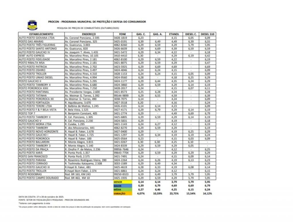 A Prefeitura de Dourados, por intermédio do setor de fiscalização do Procon de Dourados, divulgou nesta terça-feira nova pesquisa de preços de combustíveis. O levantamento foi realizado nos dias 27 e 28 de outubro, em 40 estabelecimentos da cidade e distritos.