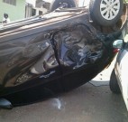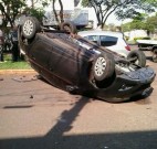 Cada vez mais violento, o trânsito de Dourados registrou no início da tarde desta sexta-feira (10) o segundo capotamento em menos de 24 horas. Hoje um veículo HB20 de cor preta capotou após desrespeitar uma placa de parada obrigatória e colidir com um Ford Ka prata no cruzamento da Rua Benjamin Constant com a Avenida Weimar Gonçalves Torres.